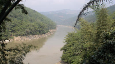 Der Tag beginnt mit einem blinden Bonzen, der mich mit seiner schwarzen Limousine fast anfährt, als er aus einer Ausfahrt kommt. Ich reagiere auf derlei mittlerweile reflexhaft mit Fußtritten gegen die Motorhaube. Irritiert schleicht der Bonze weiter, bleibt im Schritttempo wenige Meter vor mir. Ich denke: Ist der etwa von der Partei und macht auf Mr. Wichtig? Oder ist das nur die Autofahrer-Variante gegen Gesichtsverlust? Am Ende werde ich ihn doch noch los. Mein Ziel ist ein kleiner Hügel oberhalb von Daluo. Schweißgebadet erreiche ich den Grat zwischen den beiden Hügeln und treffe hier oben sogar auf eine kleine Hütte, vor der eine ältere Frau ihr Feld behackt. Ich finde weiter vorne ein Pausenhäuschen aus Holz, das so flach ist, dass man darin nur liegen kann, und blicke hinab auf das Flusstal mit Daluo und Daluo-Hafen (so ähnlich wie Kleinkummerfeld und Kleinkummerfeld-Bahnhof) vor den fernen Bergriesen, die im Dunst bläulich-grün schimmern. Und wenn ich den Blick weiter nach rechts schweifen lasse, so kommt dort bereits die burmesische Stadt jenseits der Grenze in Sicht. Ein paar langweilige Hochhäuser, weniger blaue Dächer, aber etwas größer ist die Stadt. Von Tropenwald ist hier auf den Hängen übrigens keine Spur. Der ganze Berg ist bestanden von derselben Baumart, eine einzige große Plantage.