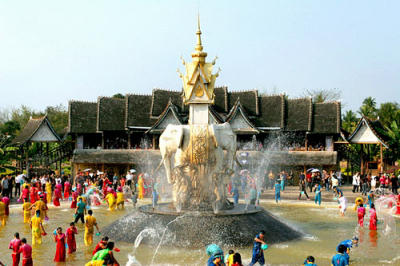 Einen Elefanten bekomme ich heute dann doch noch zu sehen, einen für Touristenfotos abgestellten mit Fußfessel und Sänfte auf dem Buckel, auch schon leicht verhaltensauffällig. Er steht am Eingang zum Garten der Dai-Ethnie, in den ich eher zufällig geraten bin. Ich war eigentlich auf dem Weg nach Manmaisangkang, aber der Bus kommt auf der Strecke, die dem Flusslauf des Mekong folgt, nur bis Ganlanba, wo ich keinen Anschluss habe. In Ganlanba zieht mich ein palmengesäumter Fahrdamm an, der zwei Seen trennt. Ich wandere den See entlang, dann folge ich einem Weg am Rand eines Bananenfeldes und komme mitten im Garten der Dai-Ethnie heraus und auf dem Weg lag auch gar kein Kassenhäuschen, obwohl ich sicher bin, dass dieses Freilichtmuseum mit lebendem Anschauungsmaterial Eintritt kostet. Angesichts der Pleite mit den Elefanten gestern habe ich auch gar keine Skrupel hier ohne Eintritt hereingekommen zu sein. Neben dem bedauernswerten Dressur-Elefanten sehe ich nun auch das nachgestellte Wasserspritzfest, das die Dai normalerweise nur einmal im Jahr abhalten, nämlich am 14. April. Von einem großen Springbrunnen aus, in dem die Damen und auch ein paar Herren in traditionellen Trachten knöcheltief im Wasser stehen, wird also wild gespritzt. Wer von den Touristen trocken bleiben will, geht besser mal auf Abstand.