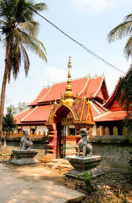 Den heutigen Tag habe ich bei sonnigen 25 Grad der Erkundung der Stadt gewidmet. Die typisch vergoldeten Kuppeln und die spitz zulaufenden Giebel, die man aus Burma und Thailand kennt, bestimmen das Bild. Beisielhaft ist ein einfacher Tempel, an dem ich vorbeikomme, aber der Eingang ist verschlossen. Anscheinend wird hier noch renoviert.