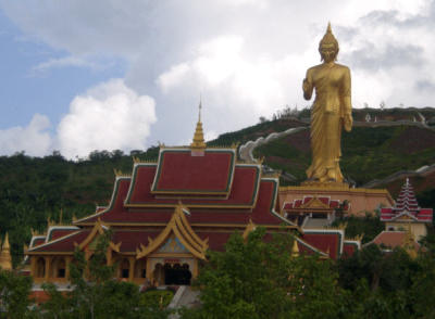 Wir kommen zu meiner letzten touristischen Aktivität hier in der Region Xishuangbanna. Es gibt laut der Broschüre der freundlichen Damen aus dem Touristenbüro hier in der Stadt das so genannte "Mengle Great Buddhist Monastery". Tatsächlich komme ich mit Buslinie 4 ganz leicht dorthin. Das Kloster liegt auf einem der Hügel am Rand von Jinghong, wo es noch von Baustellen wimmelt. Das Kloster selbst scheint offenbar auch noch nicht alt zu sein. Der goldene Buddha hinter dem Tempelgebäude ist auf dem Bild in der Broschüre noch gar nicht zu sehen. Ich wandere eine Sandpiste durch einen unfertigen Park direkt auf das imposante Areal zu, muss aber dann am Kassenhäuschen an mich halten: Umgerechnet 16 D-Mark verlangt die Tante am Schalter für den Eintritt. Das ist doch nun wirklich das Letzte: Ein neu aus dem Boden gestampftes, seelenloses Bauwerk, kulturgeschichtlich so bedeutend wie ein Wolkenkratzer in Schanghai und dann ein Eintrittspreis wie für die Verbotene Stadt in Peking! Da lachen ja die Hühner! Ich denke: Die Chinesen sind wirklich die Könige des Nachgemachten (engl. "fake kings") und streife durch die Siedlung nebenan, der die Planierraupen, weil unten eine neue Straße entsteht, den zweiten Zufahrtsweg zugeschüttet haben.