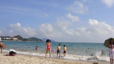 In weichen Wellen ziehen sich die hellgrünen Hügel landeinwärts, die im Osten und Westen die Bucht säumen, in der ich gerade schwimme. An einigen Stellen ragen aber auch schon weiße Villen und hässliche Hotelmonster aus dem satten Grün in die Höhe und verschandeln das Bild. Für „60 money“ kann man sich auf den Liegen unter Palmenschirmen eine Massage verabreichen lassen. Eine chinesische Familie macht sich einen Spaß daraus, den kleinen braunen Schoßhund immer wieder ins Wasser zu werfen. Ob der das wohl auch so lustig findet? Im Hintergrund fährt jemand Wasserschirm. Das geht so: Ein Schiff zieht eine Leine hinter sich her, an der ein Fallschirm hängt und an dem hängt: ein Wagemutiger. Eine Szene, die man sich auch am Strand von Alcudia vorstellen könnte und in der Tat ist Hainan, die Tropeninsel im äußersten Süden Chinas, an deren südlichstem Zipfel mit der Stadt Sanya ich mich befinde, so etwas wie das chinesische Mallorca oder eher noch Gran Canaria, wo man ja ebenfalls im Januar baden gehen kann. Nur ist die chinesische Tropeninsel viel größer, fast so groß wie Taiwan, Durchmesser knapp 300, Umfang knapp 600 Kilometer. Und wo auf Mallorca alles fest in deutscher Hand ist, bestimmen hier Russen das Bild. Fast alles, was für Touristen von Belang ist, ist auch auf Russisch beschriftet und als deutscher Urlauber wird man gelegentlich auf Russisch angesprochen.