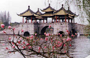 Der so genannte "schlanke Westsee" (im Gegensatz zum normalen Westsee in Hangzhou) ist die größte Attraktion der Stadt. Ausgehend vom Yechun-Teehaus wandere ich einen Kanal entlang bis zum gelben Daming-Tempel, der zusammen mit einer Pagode den Westsee im Norden begrenzt, und folge so der Strecke, die einst ein berühmter Kaiser frühmorgens mit dem Boot zurückzulegen pflegte. Als Höhepunkt gilt die auf dem Foto zu sehende "Fünf-Pavillon-Brücke", die typisch ist für den Brücken-Baustil im Süden Chinas und als Wahrzeichen von Yangzhou betrachtet wird. Was hier nicht zu sehen ist, sind die Horden von Touristen, die den Pavillon belagern, und die Armadas von so genannten "Lustbooten", das sind Paddelboote mit Drachenkopf, auf denen Touristen sich über den See schippern lassen.